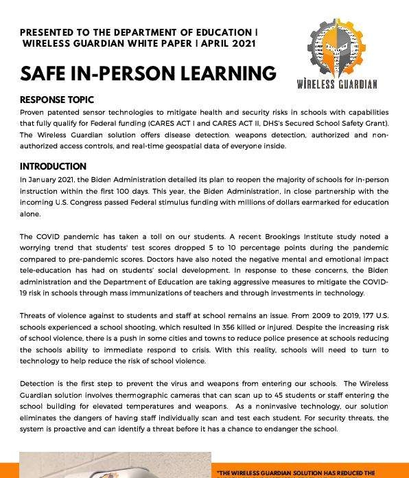 While the COVID pandemic has waned, threats of violence against students and staff at school remain an issue. In this whitepaper presented to the U.S. Department of Education, discover how schools ensure the safety of students and staff with Wireless Guardian pro-active, non-invasive technology that identifies a threat before it has a chance to endanger the school.